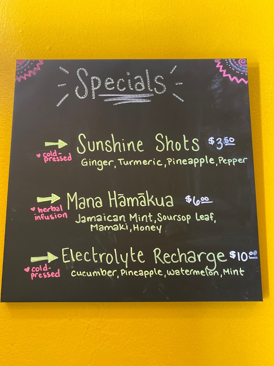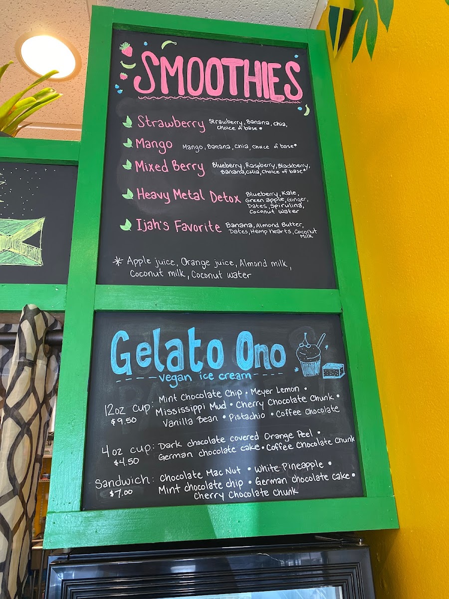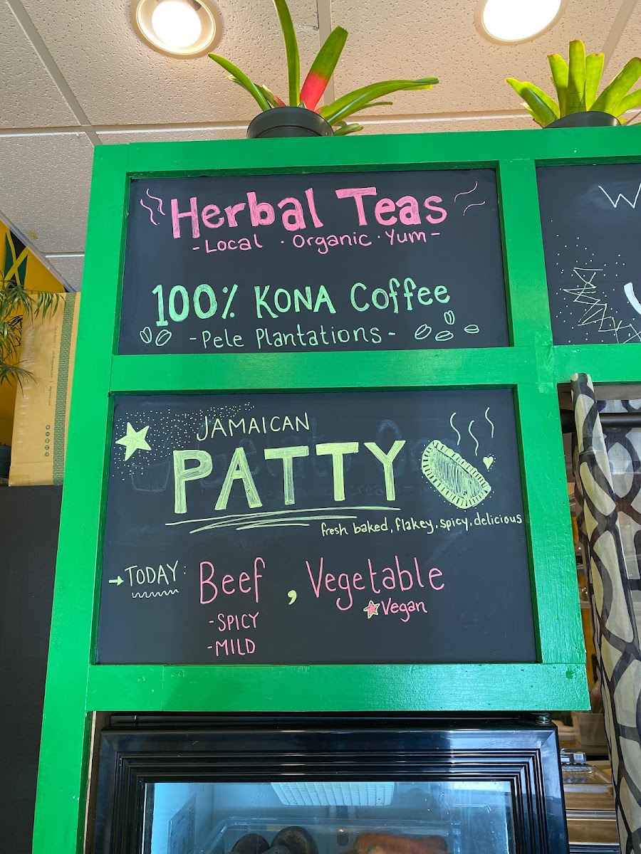 Food items commonly available include wraps and patties, with options that accommodate different dietary preferences, including vegan and vegetarian choices. Some menu highlights noted by visitors are juice blends like turmeric-based cold press juices and items such as jerk jackfruit wraps, curry chicken wraps, curry patties, roasted vegetable quinoa bowls, salads, and beef pockets.